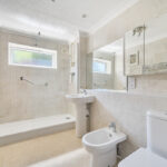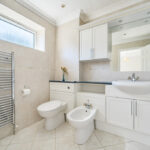 EN-SUITE BATHROOM Fully enclosed shower cubicle with independent shower unit, inset wash hand basin with toiletries cupboards under, bidet, low level flush w.c., mirror with downlighting, heated chrome towel rail, fully tiled walls, tiled flooring.