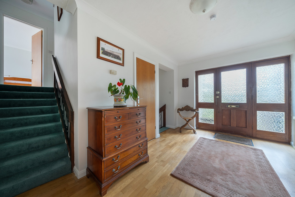 RECEPTION HALL Oak flooring, radiator, built-in cloaks cupboard, built-in shelved storage cupboard.