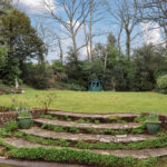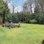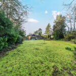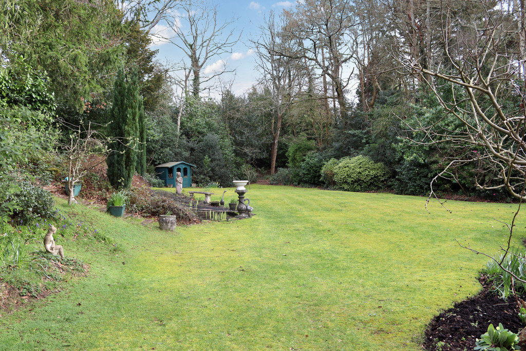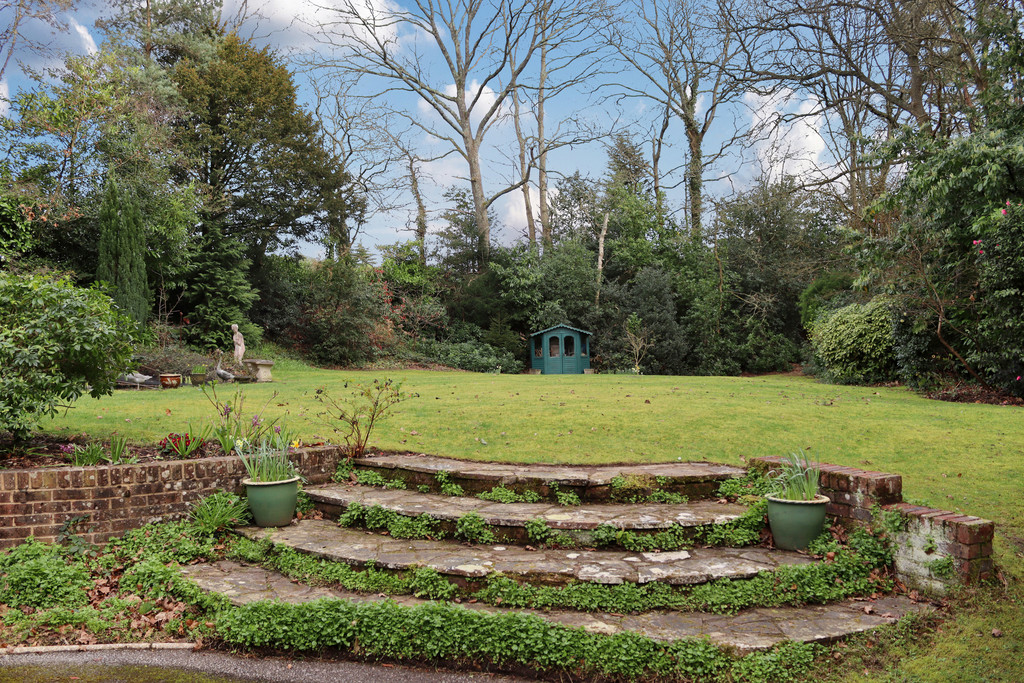 REAR GARDEN With steps up offering a high degree of privacy, extensive lawned area, ornamental pond with water feature, summerhouse, two greenhouses, screened by mature trees and shrubs.