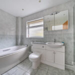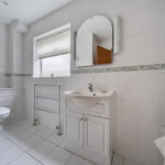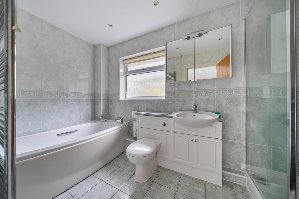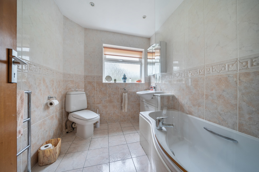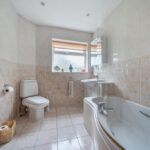 FAMILY BATHROOM 'P' shaped bath with fitted glass and chrome screen, inset wash hand basin, low level flush w.c., heated chrome towel rail, fully tiled walls.