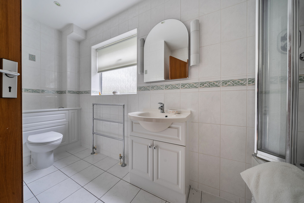 EN-SUITE SHOWER ROOM Panelled bath with fitted shower attachment, heated chrome towel rail, large walk-in double shower with fitted independent shower unit with glass and chrome screen, inset wash hand basin with toiletries cupboards under, push flow w.c., fully tiled walls, double glazed window.