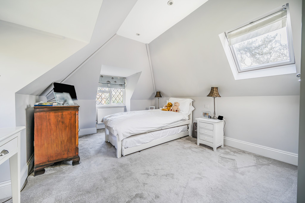 BEDROOM TWO 14' 6" x 13' 0 into bay" (4.42m x 3.96m) Triple aspect room, radiator, built-in wardrobe cupboards, Velux window.